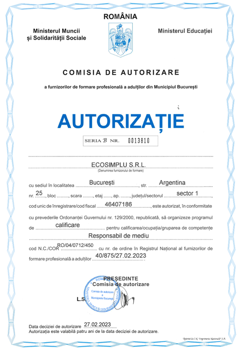 S.C. ECOSIMPLU S.R.L. deţine autorizaţie emisă de Comisia de autorizare a furnizorilor de formare profesională a adulţilor din Municipiul Bucureşti pentru organizarea programului de calificare pentru calificarea ocupaţiei/competenţei de “Responsabil de Mediu” cor COR 325710